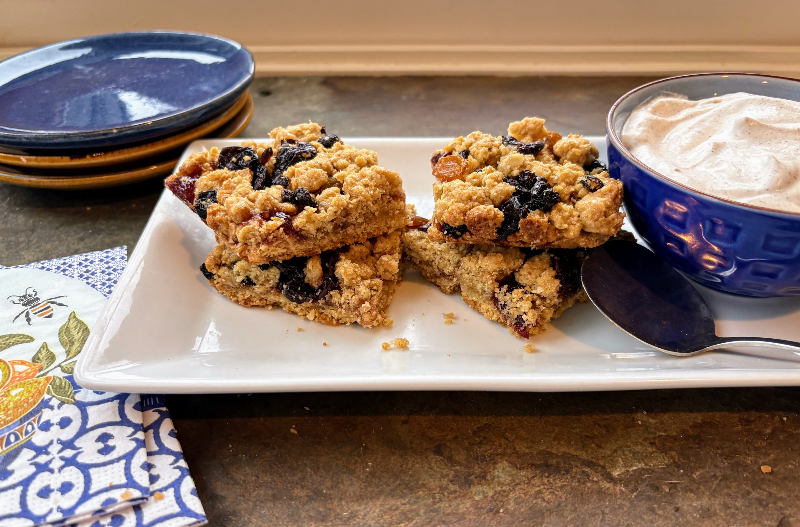 For my version I made a dough of oatmeal flakes (ground to a powder in a food processor), flour, brown sugar, and diced butter. Then I patted half of this mixture into a baking pan and baked it until lightly browned. A strawberry jam layer came next. For the final layer I mixed a trio of dried fruits—cherries, currants, and golden raisins— with the remaining dough and spread it atop the strawberry layer. After baking I cut squares rather than triangles from my pastry.